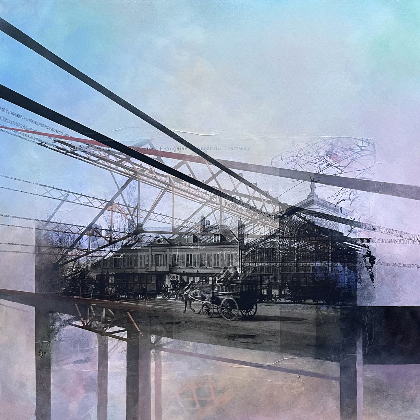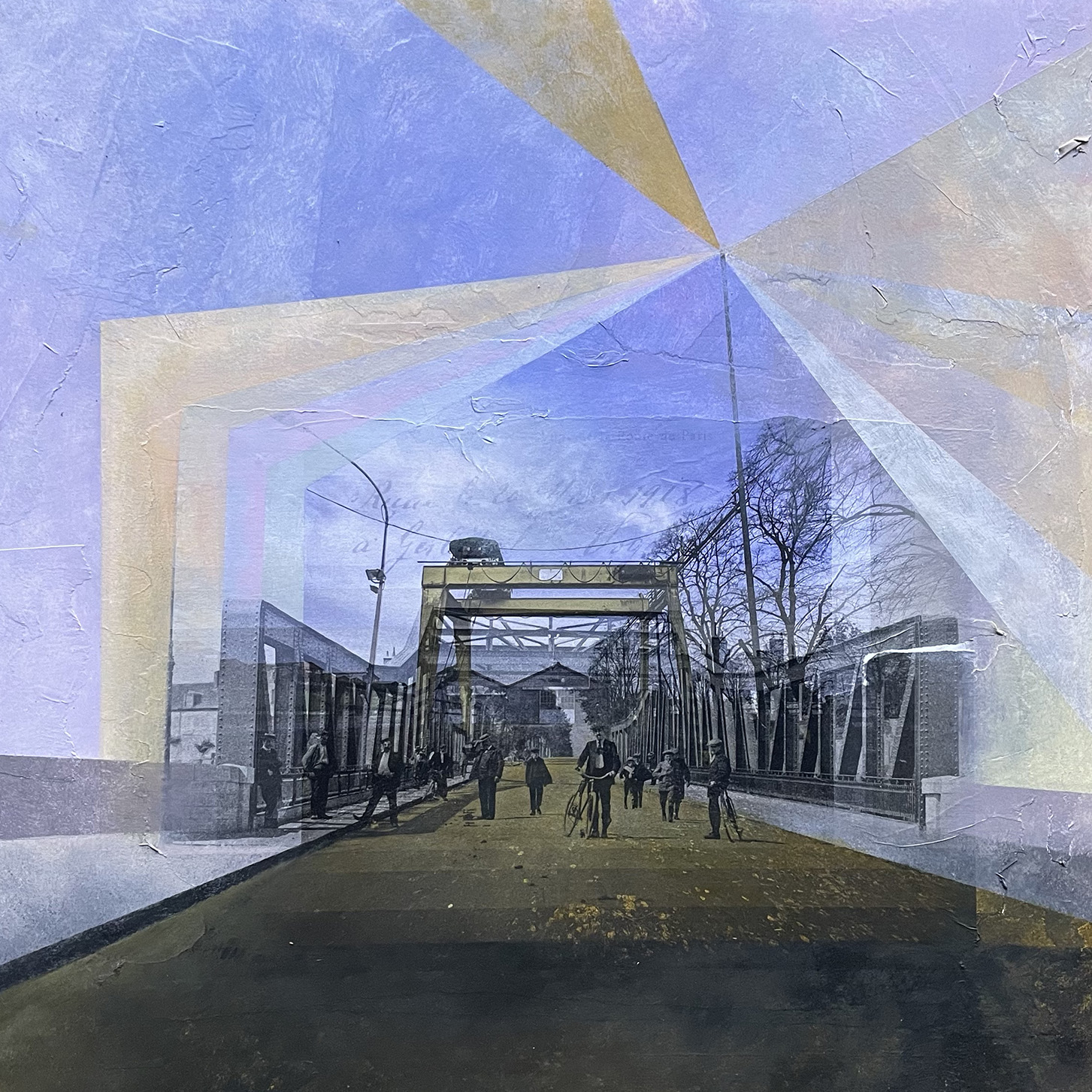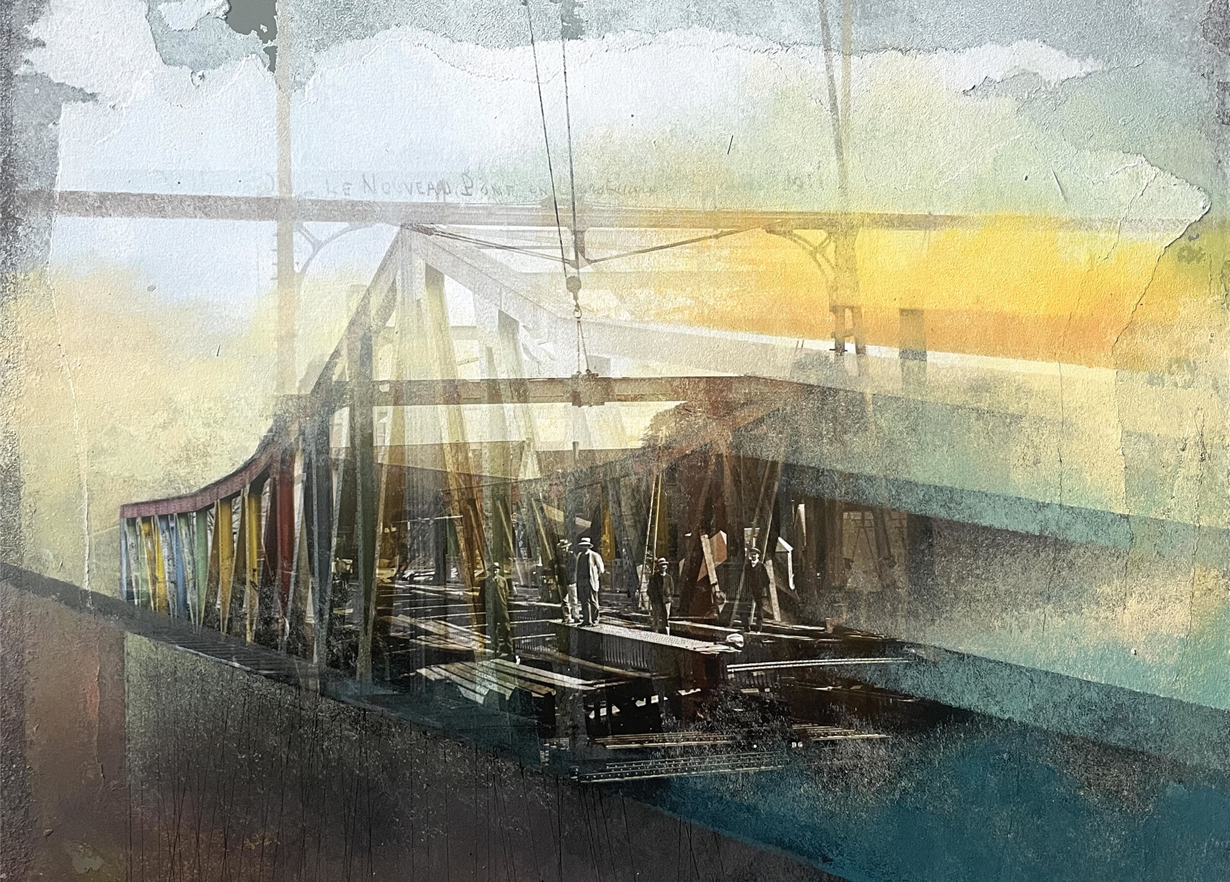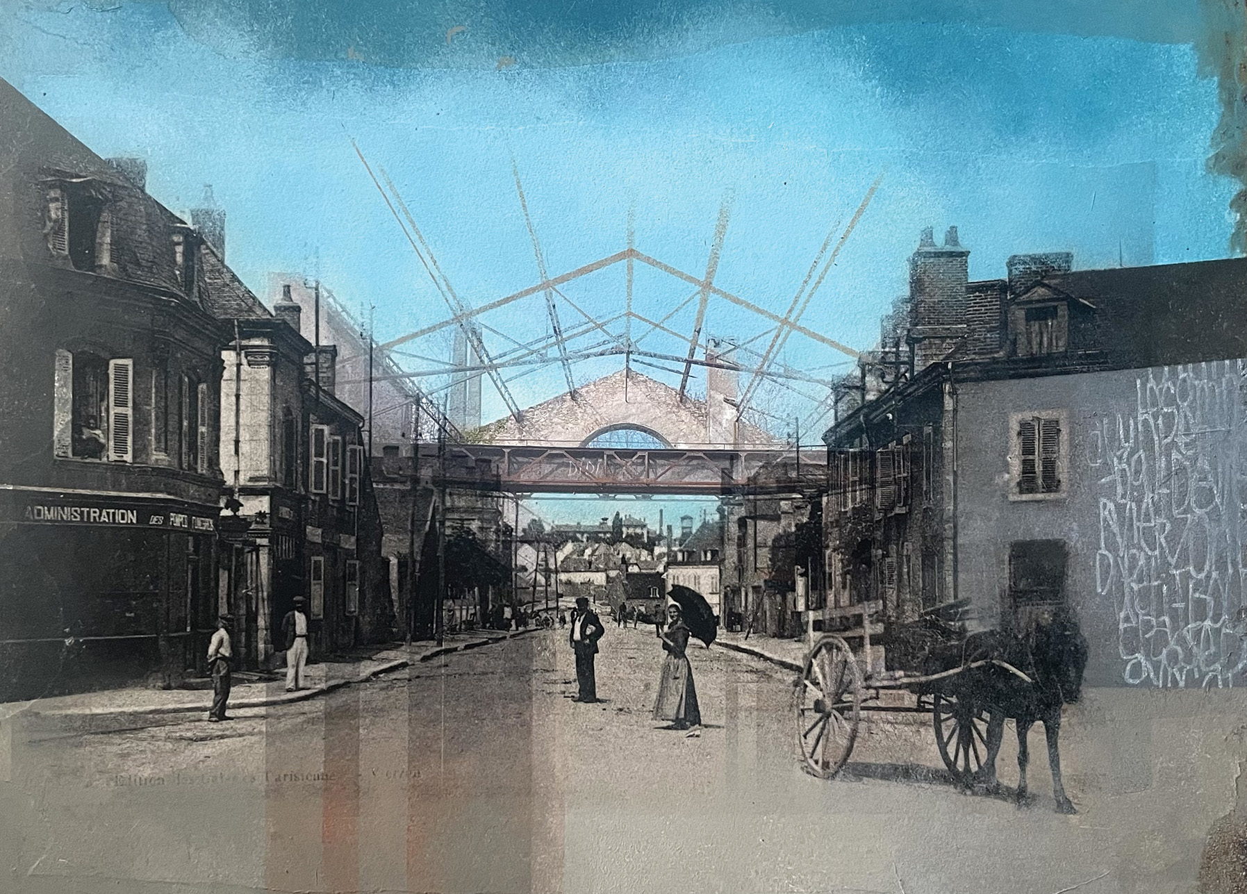 Dans cette parenthèse, j’ai pris des libertés avec les strates du temps, et calé mon pas sur les empreintes de celles et ceux qui ont arpenté les mêmes rues, les mêmes quais, les mêmes rêves. Ils sont devenus les personnages principaux de mes toiles et de mes pensées, cette ouvrière au regard malicieux, ce vanneur aux aguets, ces ouvriers avec leur marteau pilon, ces commerçants posant fièrement sur le pas de leur porte, ces enfants jouant dans les rues, cette femme attendant le tramway sous son ombrelle, ces hommes faisant une pause pendant la construction du pont de Toulouse…