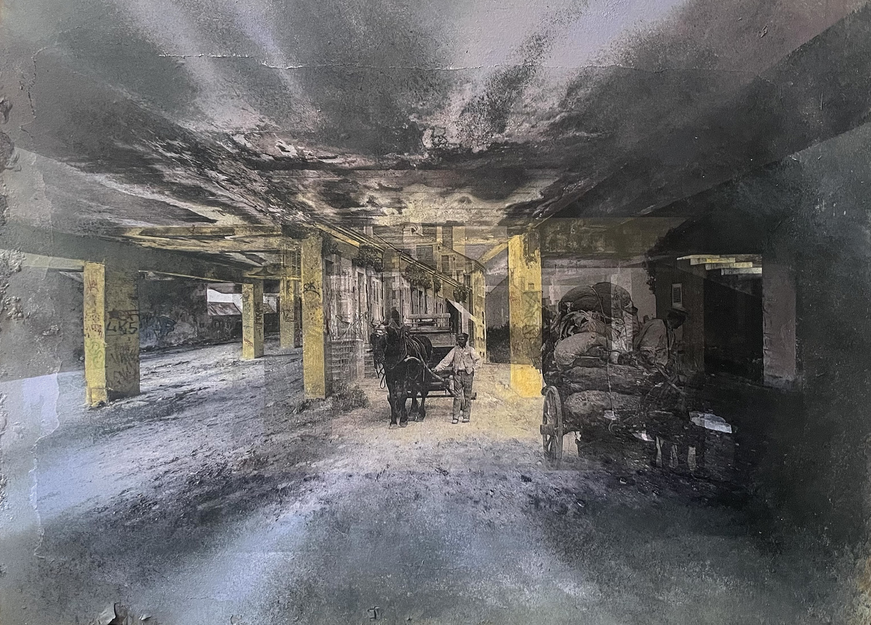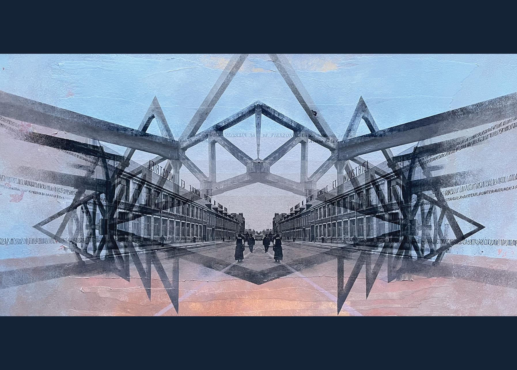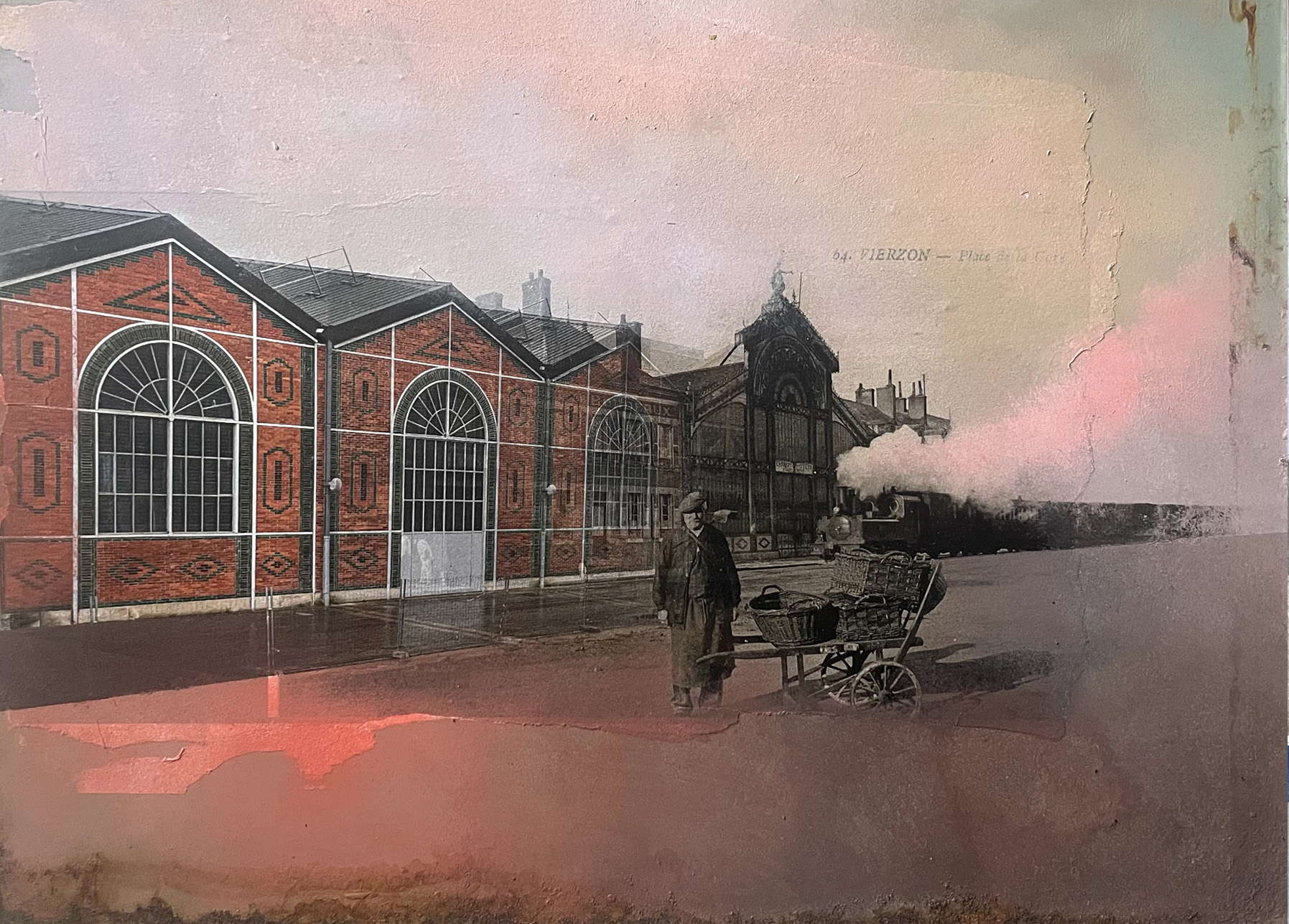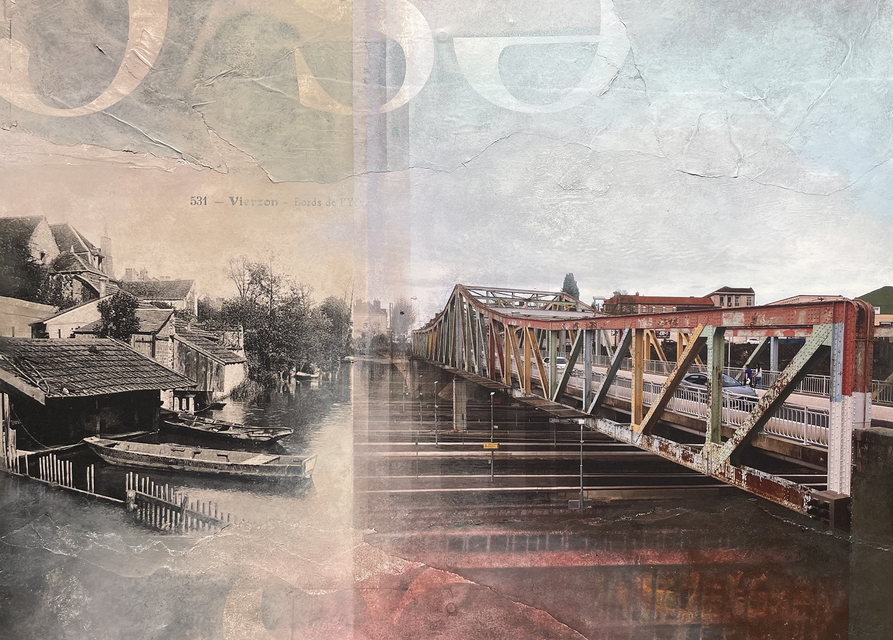 Dans cette parenthèse, j’ai pris des libertés avec les strates du temps, et calé mon pas sur les empreintes de celles et ceux qui ont arpenté les mêmes rues, les mêmes quais, les mêmes rêves. Ils sont devenus les personnages principaux de mes toiles et de mes pensées, cette ouvrière au regard malicieux, ce vanneur aux aguets, ces ouvriers avec leur marteau pilon, ces commerçants posant fièrement sur le pas de leur porte, ces enfants jouant dans les rues, cette femme attendant le tramway sous son ombrelle, ces hommes faisant une pause pendant la construction du pont de Toulouse…