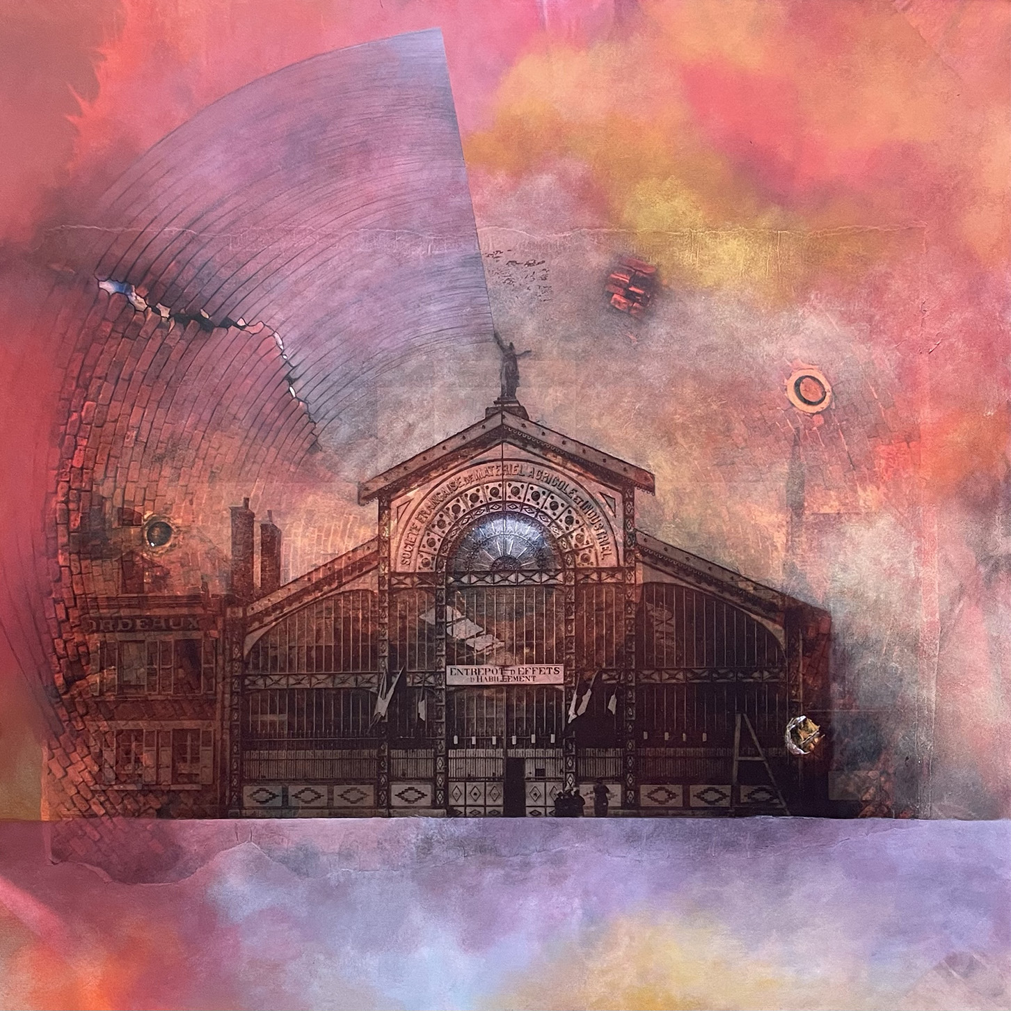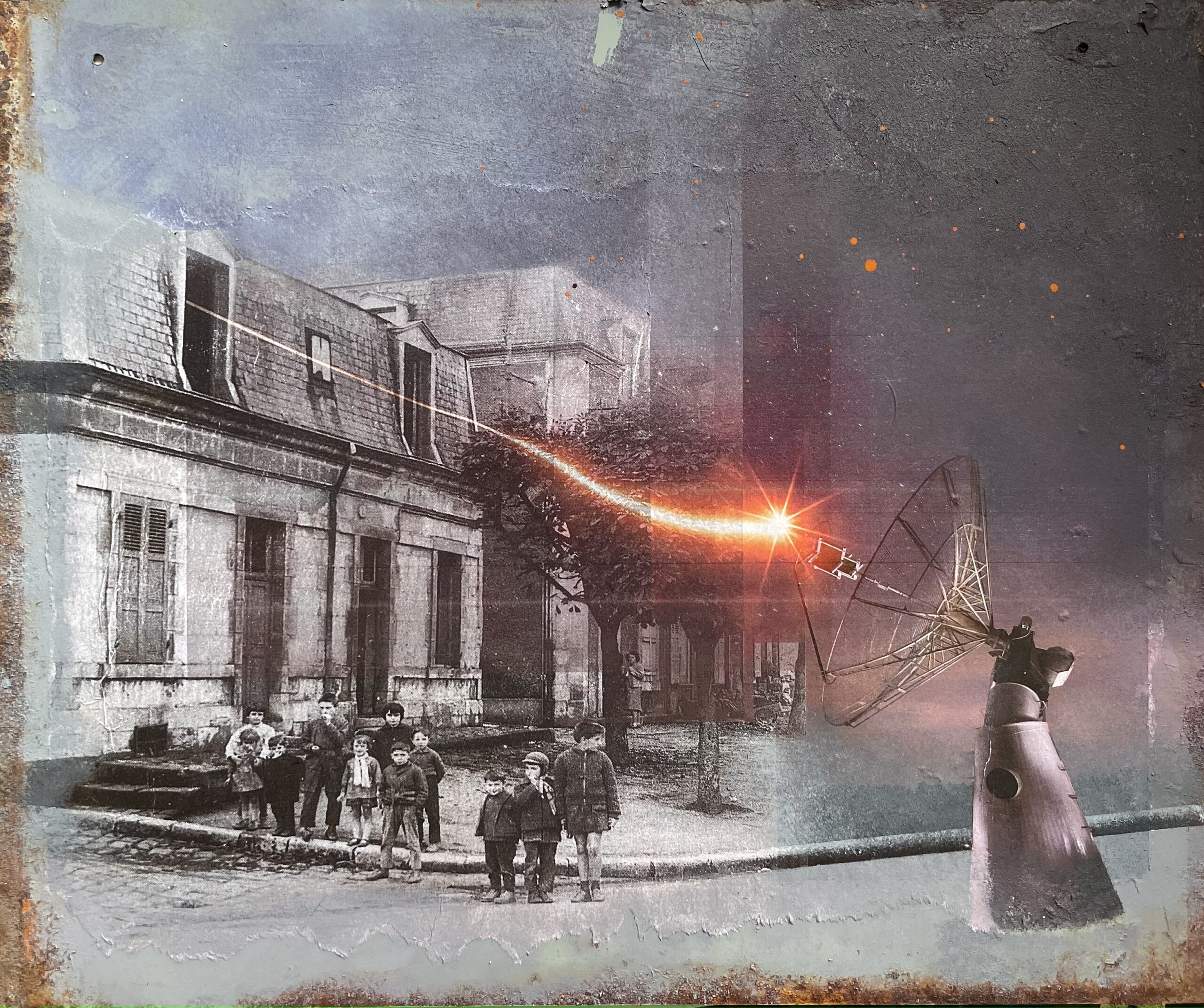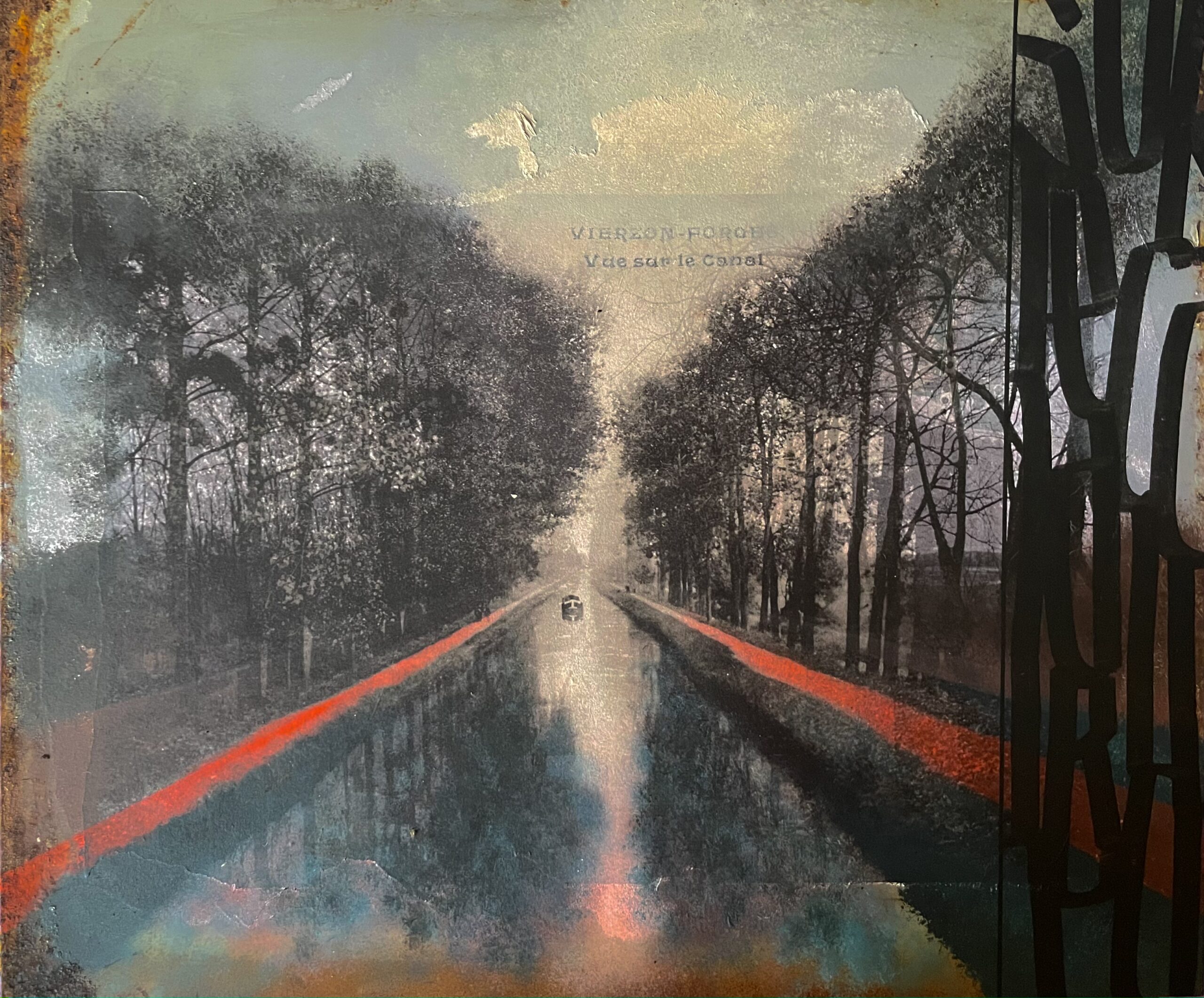 À coups de collages, de marouflages, de pinceaux, de touches de bombe aérosol sont nés des lieux imaginaires, des panoramas fictifs et aériens, à la frontière entre le déjà-vu et le mirage. Ni tout à fait ici, ni tout à fait là-bas. Une invitation à perdre momentanément ses repères, à lâcher prise pour laisser vagabonder son esprit dans les interstices poétiques du réel.