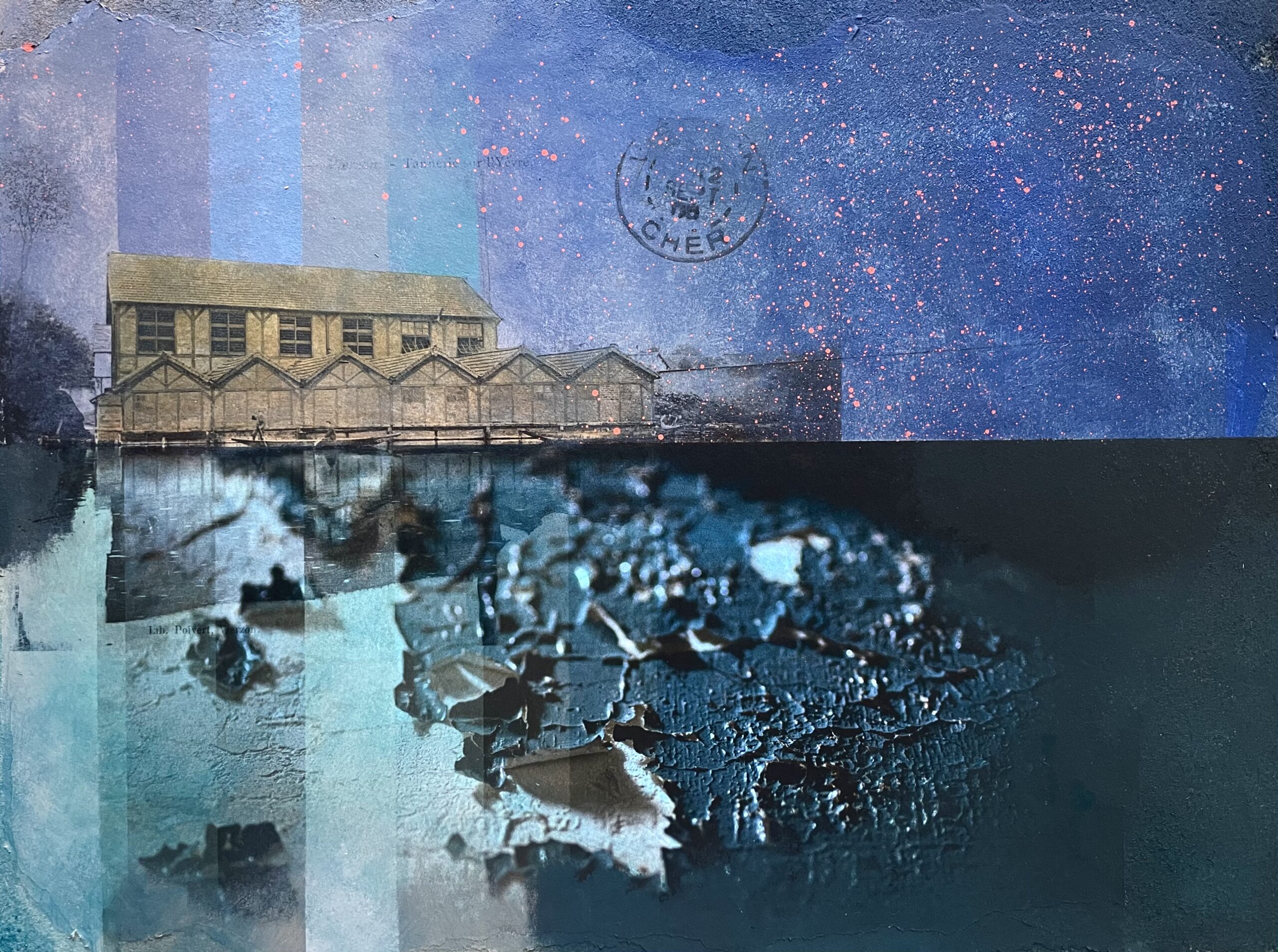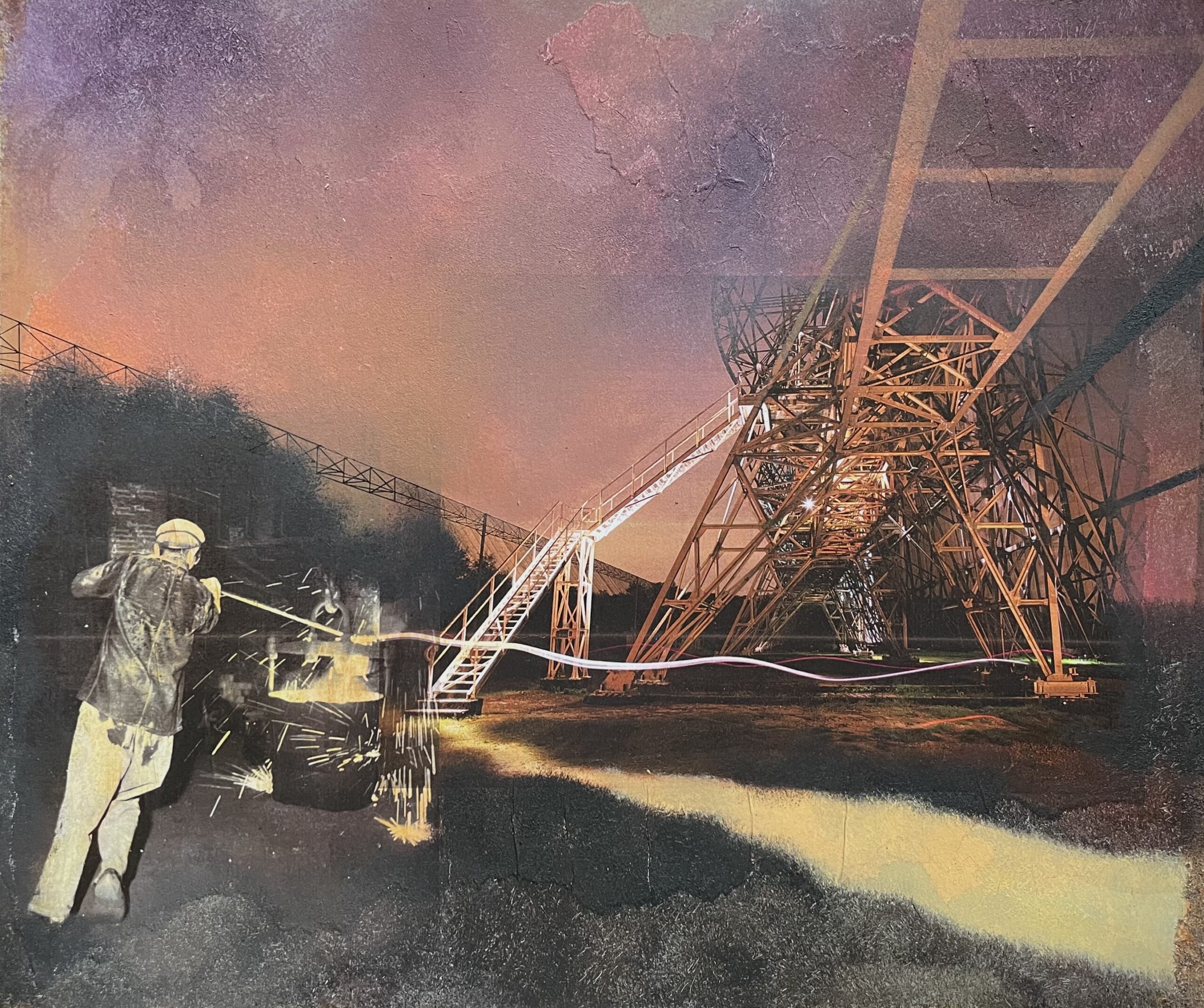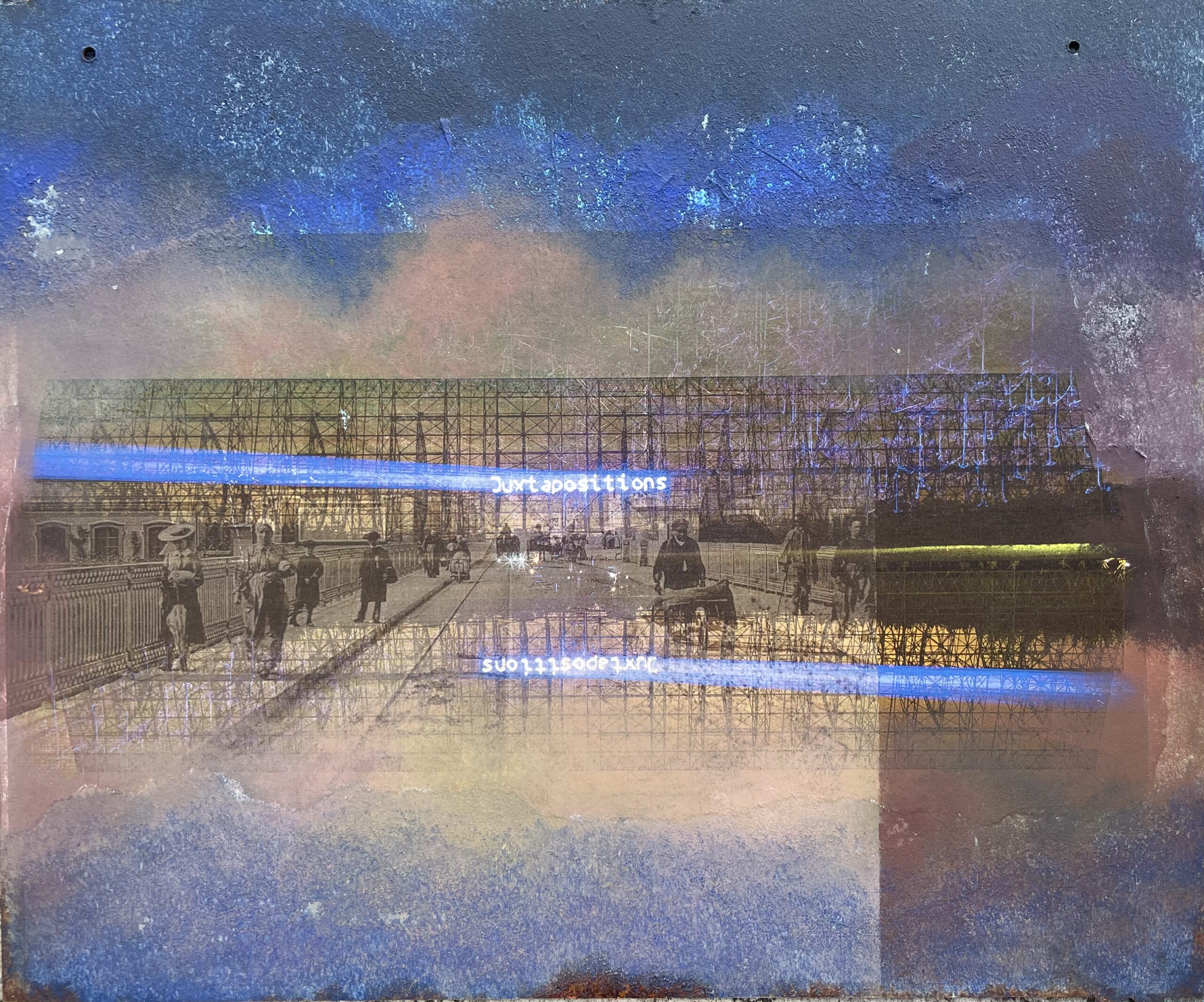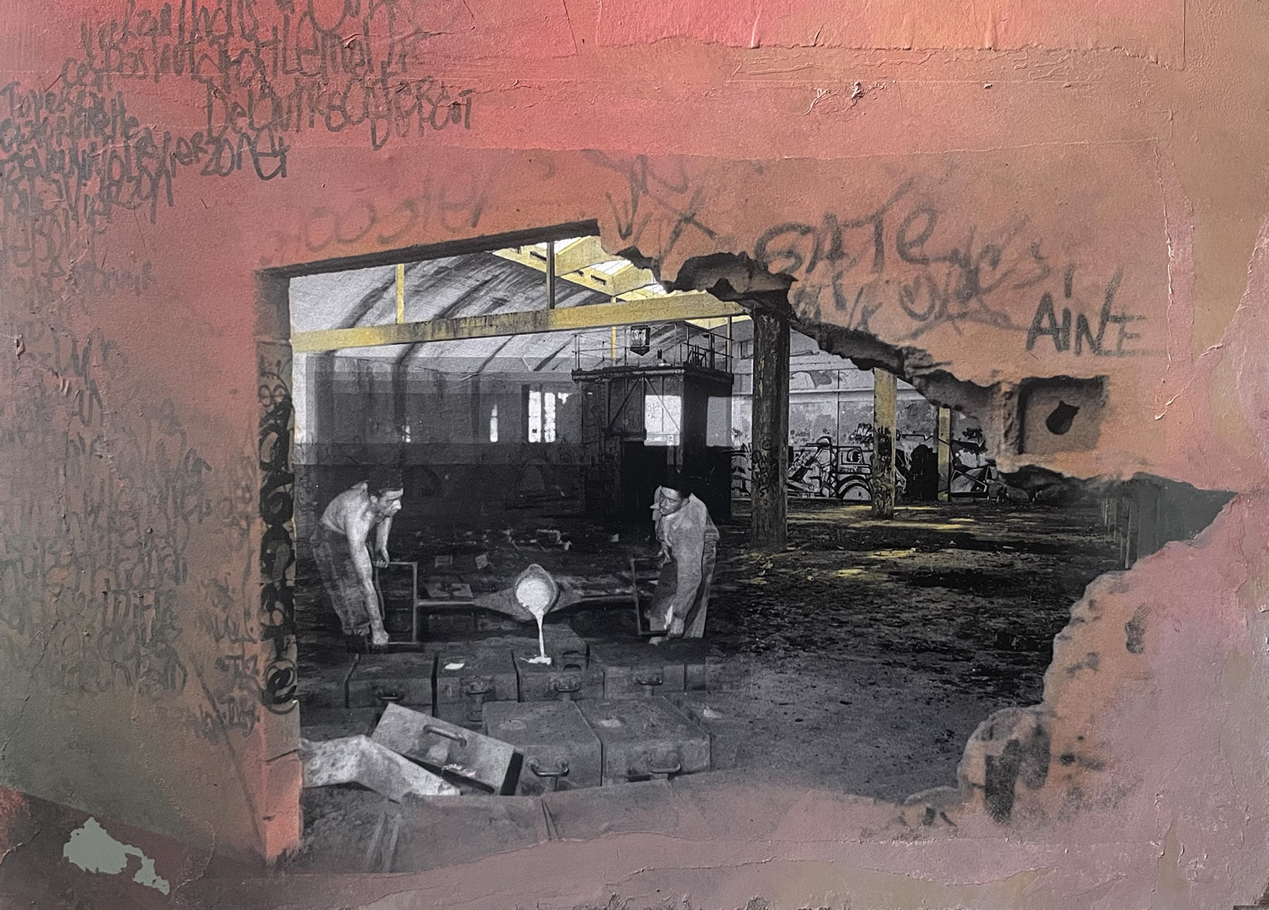 À coups de collages, de marouflages, de pinceaux, de touches de bombe aérosol sont nés des lieux imaginaires, des panoramas fictifs et aériens, à la frontière entre le déjà-vu et le mirage. Ni tout à fait ici, ni tout à fait là-bas. Une invitation à perdre momentanément ses repères, à lâcher prise pour laisser vagabonder son esprit dans les interstices poétiques du réel.